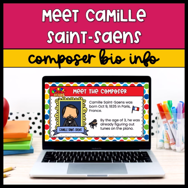 The PowerPoint also contains biographical information about composer Camille Saint-Saens and fun information about the story behind Carnival of the Animals.