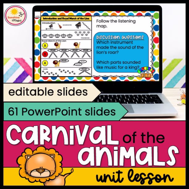 This product contains PowerPoint slides for all fourteen (14) movements of Carnival of the Animals by Camille Saint-Saens. Each movement includes a guided listening slide, a movement activity and a coloring activity slide.